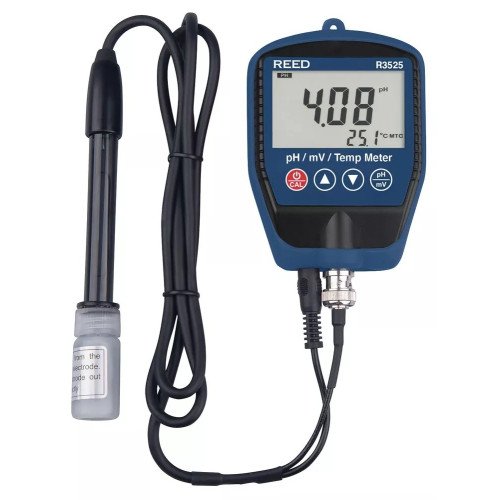 Measures pH or mV while simultaneously displaying temperature. The R3525 features a microprocessor that allows automatic buffer solution recognition, 3-point calibration to ensure high accuracy, and a protective rubber holster.
