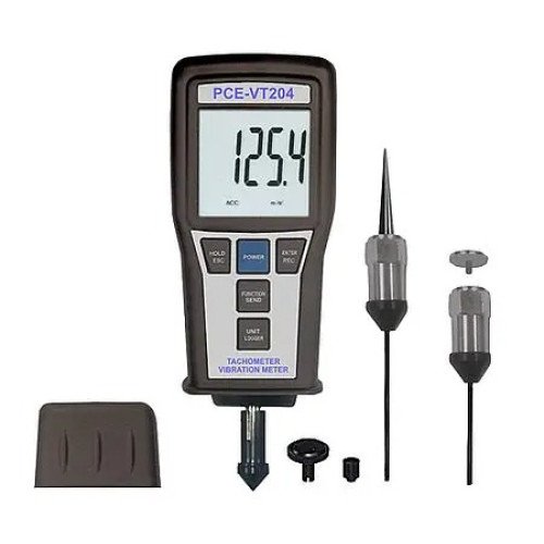 The PCE-VT 204 is a multifunction handheld tachometer with the ability to accurately measure both rotation and vibration. An ideal tool for the testing and inspection of machine parts and components such as motors, transmissions, gears, gear boxes and wheels, this multi-purpose device measures revolutions per minute (RPMs) as well as three-axis vibration, i.e., velocity or speed, displacement and acceleration.