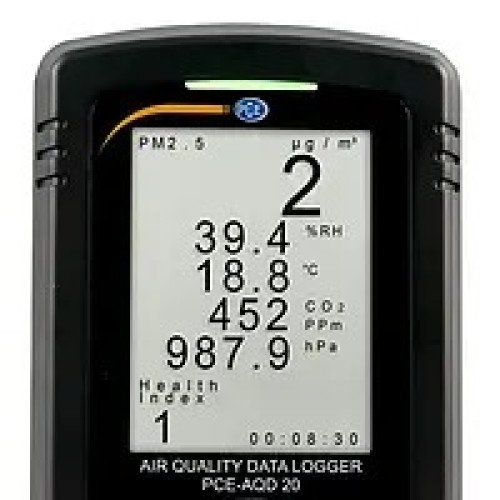 The Carbon Dioxide Meter PCE-AQD 20 is an ideal measuring device for monitoring the air quality at workplaces. The air quality data logger is ideal for continuous logging of air temperature, humidity, CO2, PM2.5 and air pressure. All these parameters give the occupational safety expert information about the air quality. The measured values ​​are stored by the CO2 air quality data logger on an SD memory card.