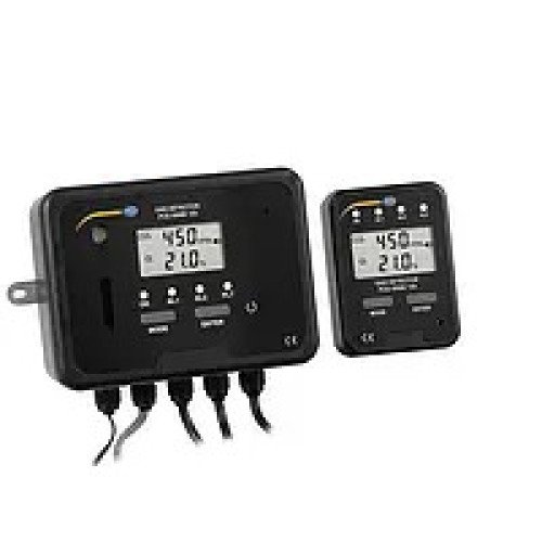 The CO2 warning device PCE-WMM 100 consists of a main unit and a remote display. The CO2 gas detector PCE-WMM 100 is used to measure carbon dioxide and oxygen in a fixed location. The CO2 warning device protects people from the odourless gas CO2 and also warns of low oxygen content in the air. The gas warning system displays the measured values on an LCD. The PCE-WMM 100 CO2 warning device has two relays that can be used to control alarm lights or sounders. Furthermore, the CO2 warning device has an integrated, acoustic alarm, which emits an audio signal of 80 db in the event of an alarm.