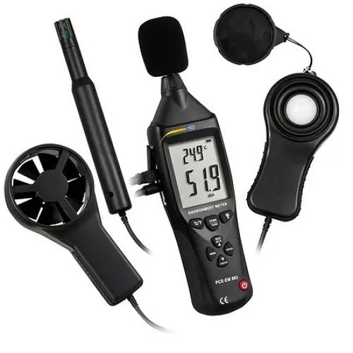 Our multifunctional hygrometer PCE-EM 883 combines all important features for measuring the ambient conditions in one device. The hygrometer is designed as fast as possible to determine as many parameters as possible. Due to the large number of external sensors that the hygrometer brings with it, such fast and precise measurements are possible. Our multifunctional hygrometer is able to detect not only the sound level but also the temperature, the light, the wind speed and the humidity of the environment.