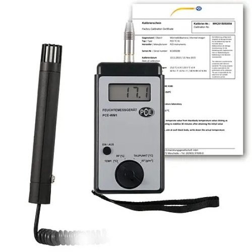 PCE-WM1 is a multi-function temperature meter used to determine relative humidity (% RH), absolute humidity (g/m³), air temperature, dew-point temperature and surface temperature (°C). This Metric-only measuring instrument comes complete with an external sensor probe for taking the surface temperature of different materials.
