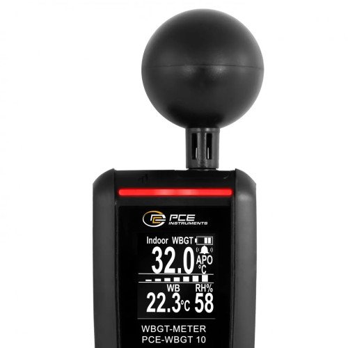 An acoustic, adjustable WBGT alarm provides additional safety, while the real-time display, automatic switch-off and customizable standby mode ensure convenient operation. With switchable units between °C and °F, an easy-to-read 1.8-inch LCD display, USB-C charging function, compact design and a 46 mm diameter sensor ball, this device is handy, versatile and easy to use.