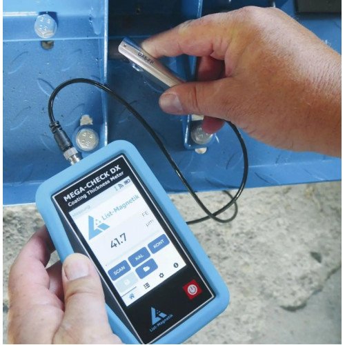 The integrated scan function allows rough surfaces to be scanned with subsequent statistical evaluation. An analogue bar graph display supplements the numerical measured values and enables trends or deviations to be identified quickly. The duplex function simultaneously measures the individual layer thicknesses of insulating coatings on galvanized steel (only in conjunction with the DX52-D or DX52-DP probes).