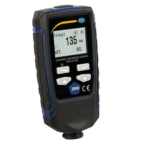 PCE-CT 65 is a material coating thickness meter that uses magnetic induction (ferrous) or eddy current (non-ferrous) to take non-destructive measurements of coating and dry film thickness (DFT) on metal substrates such as steel and aluminum. This thickness meter is ideal for painted and powder-coated surface testing, automotive paint inspection, coated material testing, and manufacturing quality control applications.