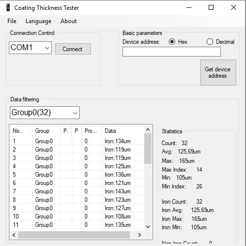 The easy-to-use downloadable PC-compatible software included with this thickness meter allows for detailed analysis of measurement results via computer. Measurement values are shown in a table and different working modes can be selected for data filtering. Statistics include the maximum, minimum and average value per working group. Statistics can be divided by ferrous and non-ferrous material. The software also counts how many readings have been stored in each material group. For more details, please refer to the user manual.