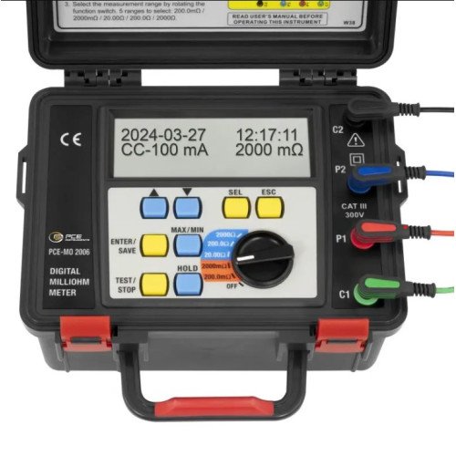 Equipped with an integrated fuse (200 mA/600 V) and three test currents, it offers reliable protection and flexibility. The milliohmmeter complies with the CAT III 300V safety standard. The device has an internal memory that can store a maximum of 200 values, which can also be recalled via the display. In addition, the MAX/MIN/HOLD functions allow important values to be displayed. The milliohmmeter has a 5.1 inch LC display with backlighting. The robust housing (protection class IP65 with closed cover) enables use in harsh conditions, and the low battery indicator ensures the reliability of the device.