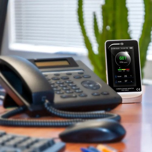 The CO2 Analyzer is a CO2 measuring device for desktop use. The carbon dioxide meter measures the CO2 content in the air and shows the measured value on a large LC display. The CO2 content in the air is an important measure for checking the ventilation behavior in offices, classrooms, lecture halls, etc. The CO2 / carbon dioxide measuring device helps to ensure that, for example, there is regular ventilation for employees in the office. The CO2 / carbon dioxide measuring device checks indoor air quality via the CO2 content. If the CO2 concentration is below 1000 ppm, the indoor air quality is optimal. Good indoor air quality helps to promote concentration. It is also ensured that the aerosol concentration in the air is low, as the aerosols are repeatedly mixed with fresh air. The CO2 / carbon dioxide measuring device shows the air quality as a numerical measured value and as a traffic light indicator. At the push of a button, the CO2 content of the last five hours can be shown on the display. In addition to the CO2 measuring function, the CO2 / carbon dioxide measuring device is equipped with a sensor for temperature and humidity.