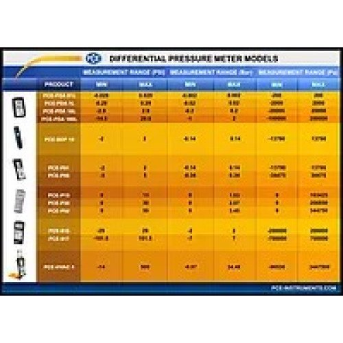 The differential pressure gauges of the PCE-PDA series are reliable differential pressure gauges for pressure measurement of gases in the range of ± 200 k , ± 2 k and 20 k depending on the model. The differential pressure gauge has many different pressure measuring functions. This gives the user more than 16 units. Furthermore, the differential pressure gauge measures in addition to the differential pressure, the temperature, flow velocity and volume flow. In addition, the maximum and minimum differential pressure can be displayed in the two- rt graphic display. The resolution of the differential pressure can optionally be switched. The differential pressure gauge incorporates a high-precision mode that increases the resolution tenfold.