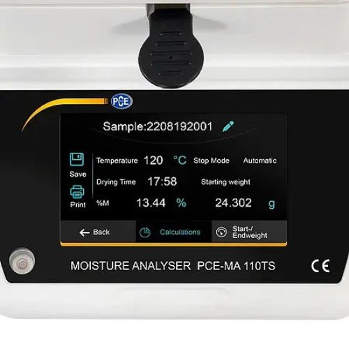 The humidity detector has a moisture measuring range of 0 … 100%. The moisture balance is operated via the 5" touchscreen. To determine the moisture content with the moisture balance, a sample is evenly distributed on the sample pan. The sample pan is then placed in the moisture balance and sealed. After setting all parameters, the moisture balance starts the measurement. The accuracy of the moisture scale is ±0.003 g. The moisture balance is therefore a precise measuring device.