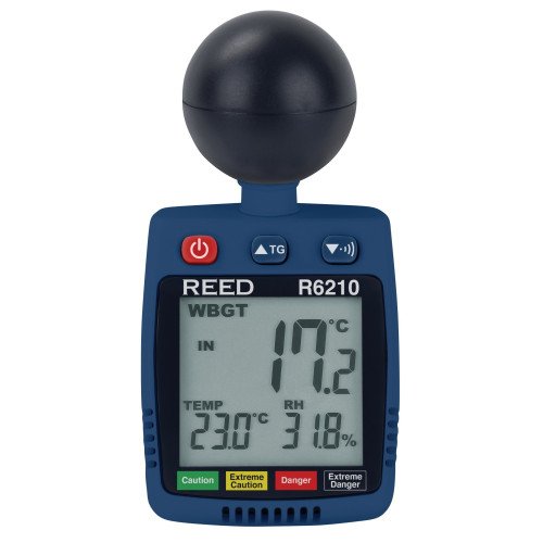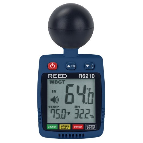 This heat stress meter measures temperature, humidity, and direct or radiant sunlight with Wet Bulb Globe Temperature (WBGT). The R6210 is OSHA recommended with a user-adjustable WBGT audible alarm and the ability to adjust settings for indoor or outdoor measurements. This personal heat stress meter features an easy-to-read LCD display, flexible armband, and tripod mount providing flexibility to meet many application requirements.