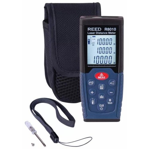 This laser distance meter measures up to 164' (50 m) and features a backlit multi-line LCD display and the ability to calculate area, volume, and sum of lengths. The R8005 is capable of retaining maximum and minimum readings and up to 99 measurements in memory.