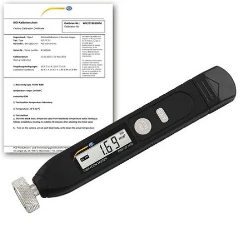 Accelerometer for vibration measurement / Measurement memory for previous measurement / Measurement of acceleration, vibration velocity and displacement in metric only / Large frequency range / Battery-operated hand-held measuring device / Automatic shutdown