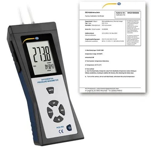 PCE-P05 is a portable handheld digital HVAC meter or differential pressure manometer used to measure differential pressure in pneumatic, compressor and pump installations, valves, tanks and heating, ventilation and air conditioning (HVAC) systems. The PCE-P05 displays min / max / average values right on the meter's screen for comparison against current measurement values.