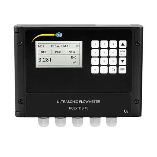 The flow measuring device is a measuring device for fixed installation. The flow rate of liquids in pipes can be determined with this flow meter. The sensors from the flow meter can be mounted directly on the pipes to be measured without having to cut them open. This enables the flow meter to be installed even during operation.