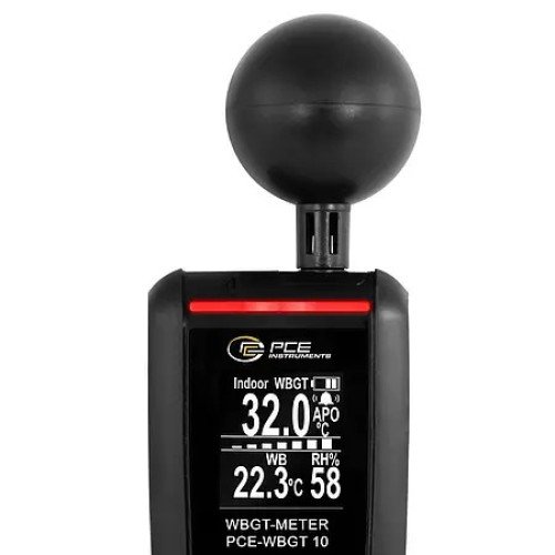 An acoustic, adjustable WBGT alarm provides additional safety, while the real-time display, automatic switch-off and customizable standby mode ensure convenient operation. With switchable units between °C and °F, an easy-to-read 1.8-inch LCD display, USB-C charging function, compact design and a 46 mm diameter sensor ball, this device is handy, versatile and easy to use.