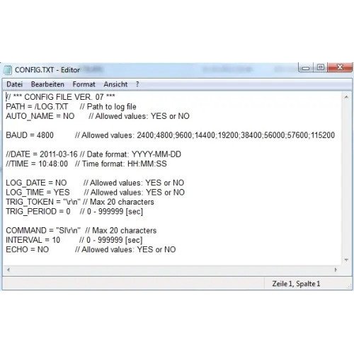 The query commands and other settings can be easily changed in a .txt format and with the help of a configuration file,transferred via the USB stick, andplayed on theRS232 - USB data logger. The RS232 - USB data logger can always save the data in the same folder or create a new folder but always after the USB flash drive has been removed from the adapter and is added again.