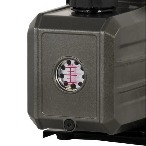 Our Two-Stage digital manifold gauge is equipped with a state-of-the-art filter element that effectively contributes to reducing oil mist. This filter element not only enhances the pump's lifespan but also ensures a cleaner working environment and contributes to environmental preservation. The ergonomically designed rubber handle allows for secure transportation and ease of handling. The digital manifold gauge is used to evacuate heat pumps, air conditioning units, and refrigeration systems before filling them with refrigerant. This is essential for removing moisture and air from the system, thereby improving the efficiency of the air conditioning system.