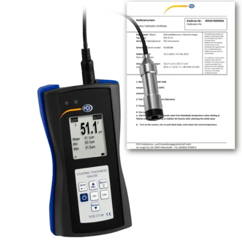 The material tester is a measuring device for the non-destructive measurement of coatings (varnishes, paints, plastics ...) on steel / iron and non-ferrous metals. Thanks to the externally connected sensor on the coating thickness gauge, measuring points that are difficult to access can also be easily reached. The menu navigation of the coating thickness gauge allows easy adjustment and setting to new parameters and makes this handy coating thickness gauge an indispensable measuring device for control measurements in production, workshop and quality assurance.
