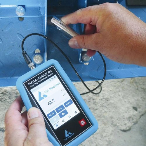 The integrated scan function allows rough surfaces to be scanned with subsequent statistical evaluation. An analogue bar graph display supplements the numerical measured values and enables trends or deviations to be identified quickly. The duplex function simultaneously measures the individual layer thicknesses of insulating coatings on galvanized steel (only in conjunction with the DX52-D or DX52-DP probes).