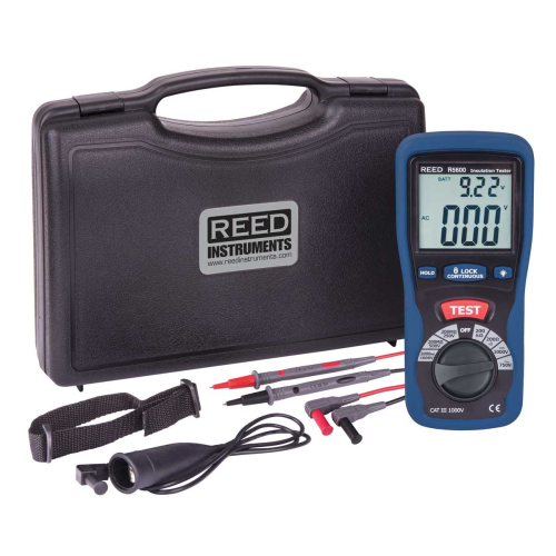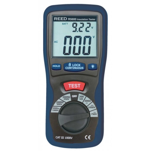 This insulation tester is capable of measuring 250V, 500V or 1000V test voltages and insulation resistance up to 2000MΩ. The R5600 features an easy-to-read backlit dual display, durable double molded plastic housing and lock function with hanging strap for handfree operation in the field.