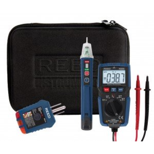 This electrical test kit includes the tools to troubleshoot common electrical problems. The R5099-KIT Electrical Test Kit includes a Compact Multimeter (R5099), AC Voltage Detector (R5110), Receptacle Tester (R5210) and Carrying Case (R9940) to keep your instruments protected and organized.