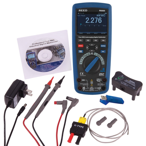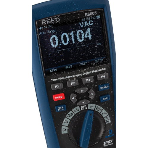 The REED R5005 True RMS Bluetooth/Waterproof Industrial Multimeter is a full featured DMM capable of data logging and measuring multiple AC/DC signals simultaneously. With a LCD screen, analog bargraph and bluetooth capability the R5005 measures AC/DC voltage and current, resistance, capacitance, frequency and temperature.