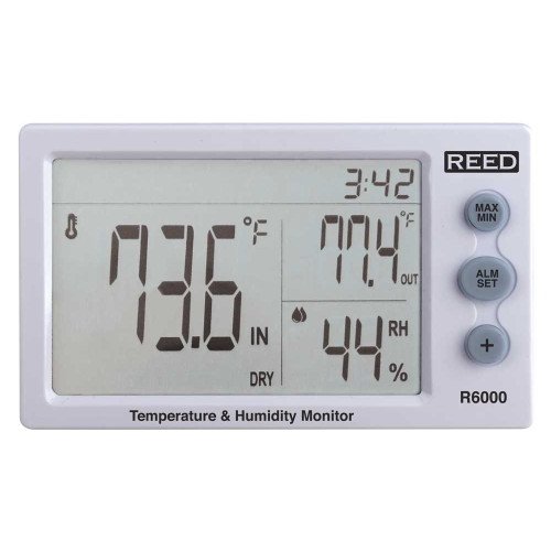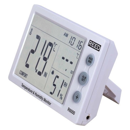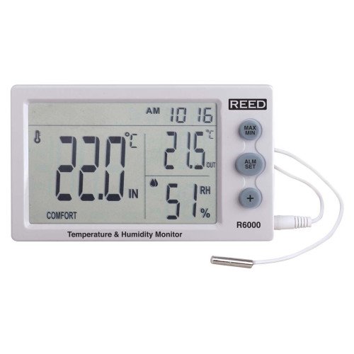 This temperature and humidity meter simultaneously displays indoor/outdoor temperature, humidity, min/max readings and time. The R6000 features a 6' (72") cable with mounted sensor for outdoor temperature measurement and humidity status icons to quickly indicate humidity conditions.